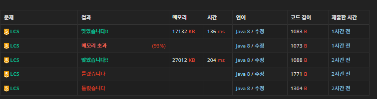 // 같지 않다면 LCS(dp)[x-1][y]와 LCS(dp)[x,y-1]