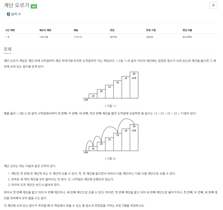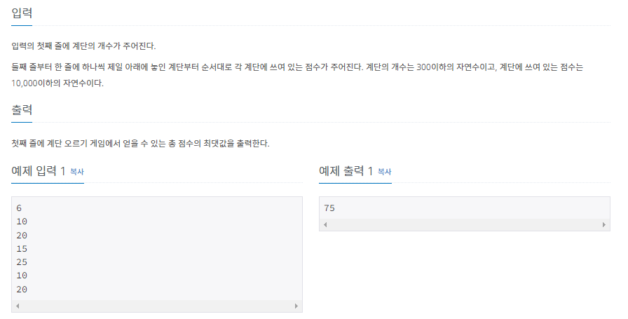 1. 계단 갯수는 최대 300개, 점수는 10,000 이하 : 최대 3,000,000(연속으로 계단 올라간다는 조건 무시) -> int 선언