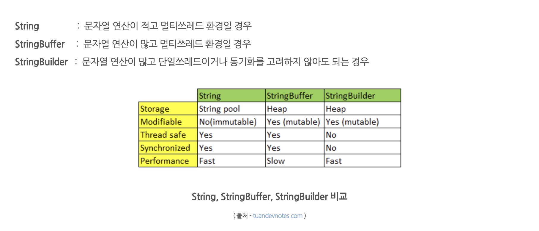 Java 에서 문자열을 다루를 대표적인 클래스로 String , StringBuffer, StringBuilder 가 있습니다. 연산이 많지 않을때는 위에 나열된 어떤 클래스를 사용하더라도 이슈가 발생할 가능성은 거의 없습니다