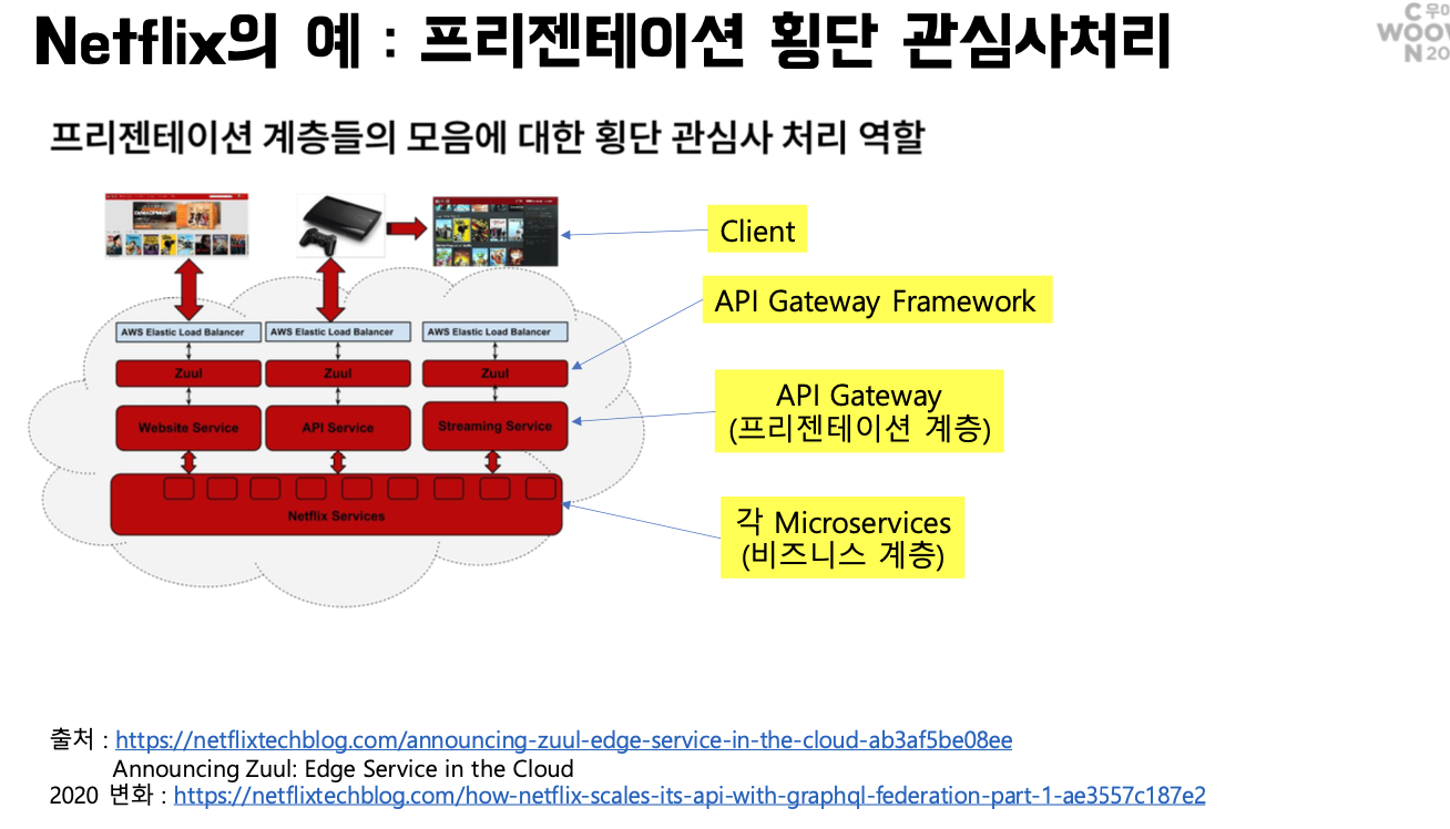 - 외부에 API를 제공하기 위한 API Gateway Pattern 은 Spring Cloud Gateway 나 Netflix Zuul
