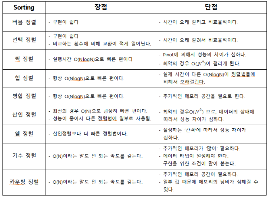 정렬 알고리즘의 장/단점은 다음과 같다.