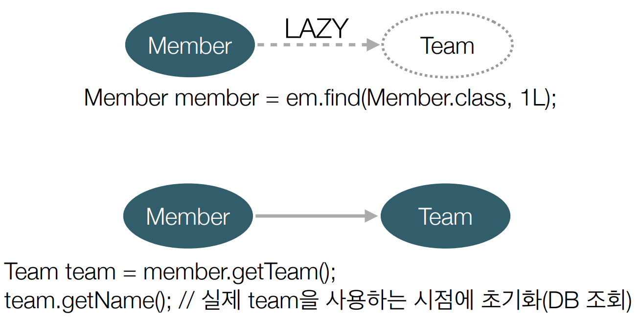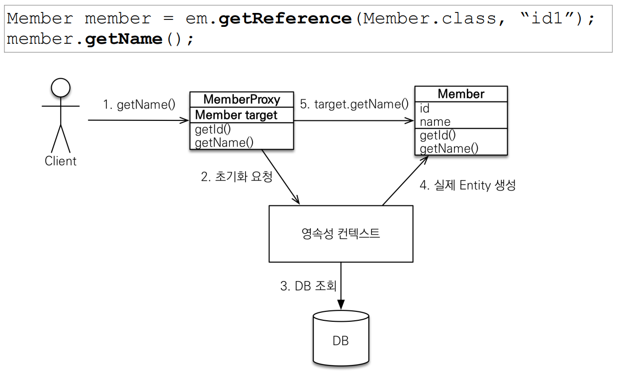 - em.getReference() : 데이터베이스 조회를 미루는 가짜 엔티티 객체 조회