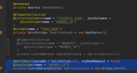 - 영속성 전이(Cascade) + 고아 객체 제거를 사용해서 값 타입 컬렉션 처럼 사용 EX) AddressEntity