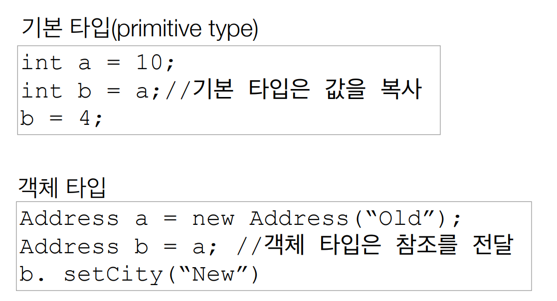 - 자바 기본 타입 => 값 복사(deep copy), 객체 타입 => 공유 참조(shallow copy)