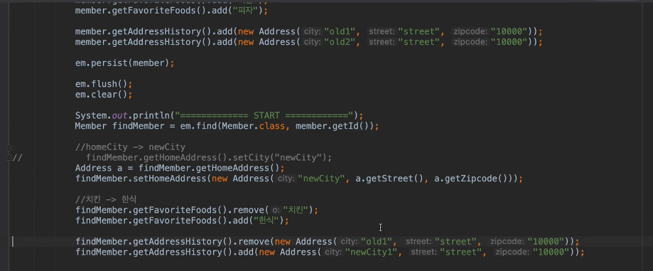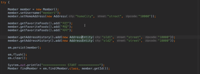 - 값 타입 컬렉션에 변경 사항이 발생하면, 주인 엔티티와 연관된 모든 데이터를 삭제하고, 값 타입 컬렉션에 있는 현재 값을 모두 다시 저장함