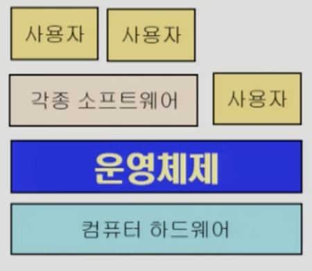 - 컴퓨터 하드웨어 바로 위에 설치되어 사용자 및 다른 모든 소프트웨어와 하드웨어를 연결하는 소프트웨어 계층
