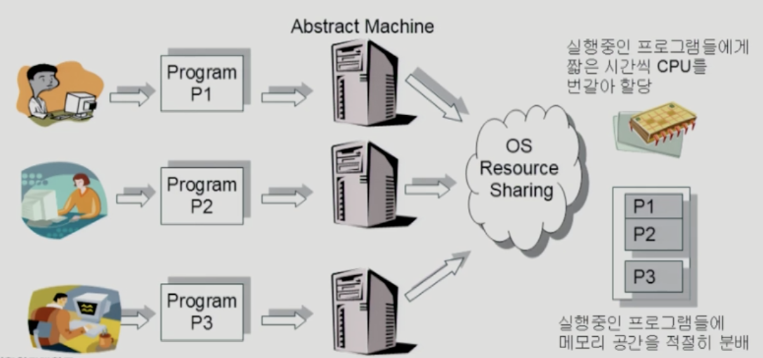 - 동시 사용자/프로그램들이 각각 독자적 컴퓨터에서 수행되는 것 같은 환상을 제공