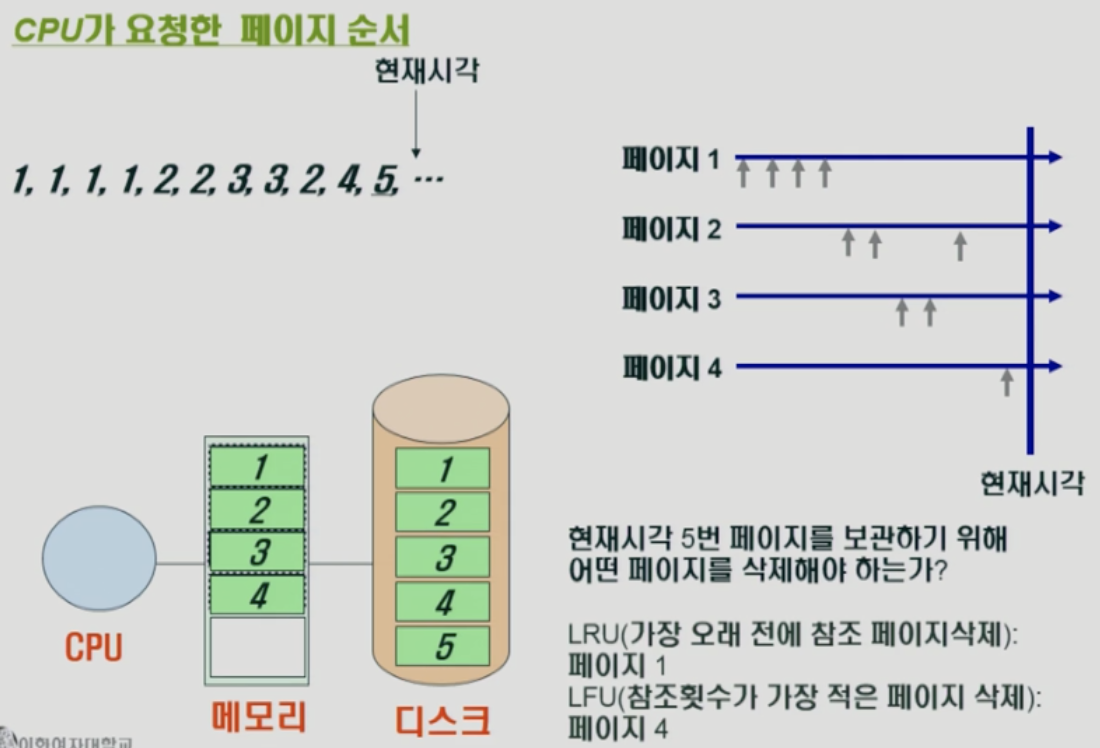 - 메모리 관리 : 미래를 모르는 상황에서 계속 사용할 페이지는 유지하고 사용하지 않을 페이지를 없애는 것이 주안점(효율성)