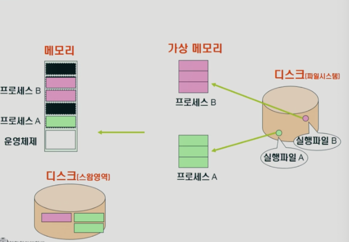 - 가상메모리 : 프로세스 각각에 대한 독자적인 메모리 공간 (논리적인 주소 할당)