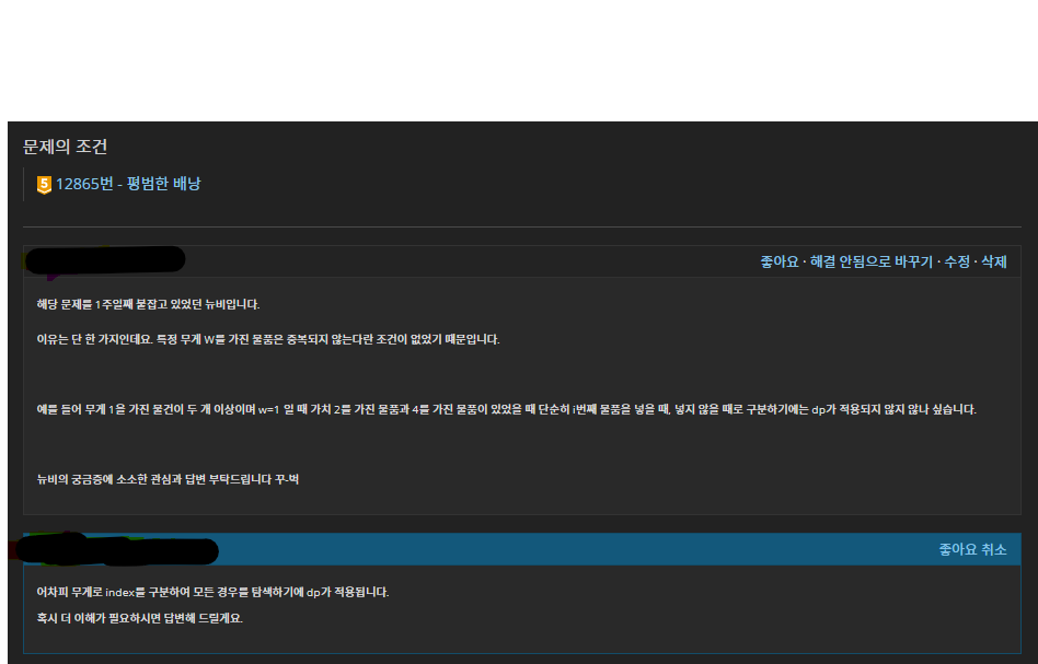 }else { // 고려할 배낭보다 무게가 작은 물품인 경우