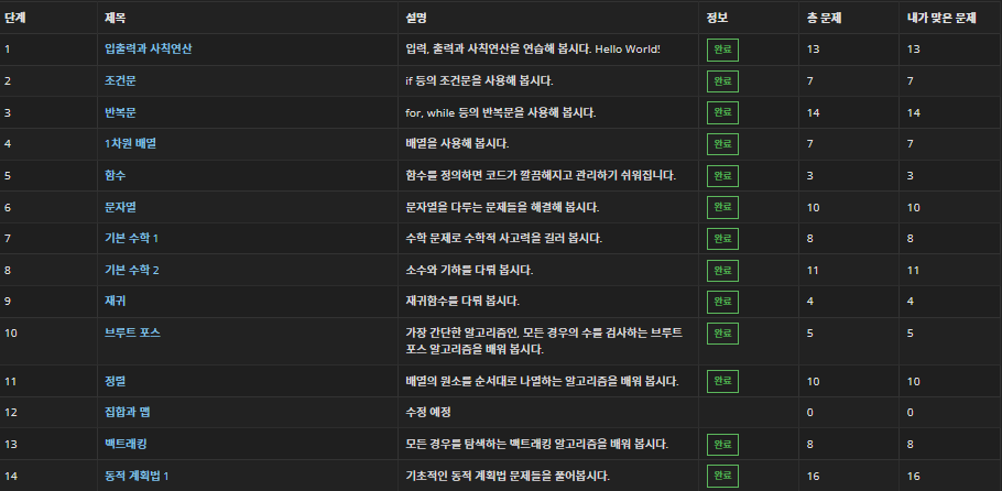 드디어 동적 계획법 1까지 단계별로 풀기를 싹 밀었다! 하지만 5개월~6개월 전부터 시작해서 앞부분에 힘겹게 풀었던 것을 또 다시 풀라고 하면 풀 수 있을지는 의문이다.