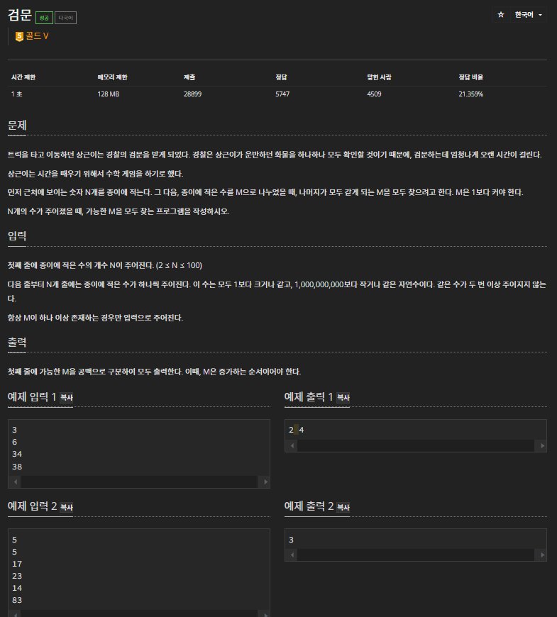 // 1. 근처에 보이는 숫자 N개를 종이에 적는다. 그 다음, 종이에 적은 수를 M으로 나누었을 때, 나머지가 모두 같게 되는 M을 모두 찾으려고 한다. M은 1보다 커야 한다.