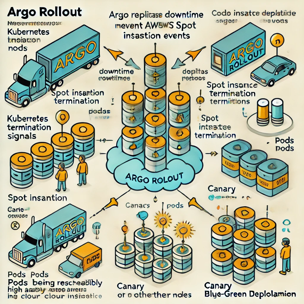 AWS Spot Termination 이벤트 발생 시, Node Termination Handler를 사용하여 노드가 종료되기 전에 Pod를 drain 처리하고 Argo Rollout을 통해 다른 노드에 재배치할 수 있습니다. 그러나 Pod가 하나만 있을 경우, 이 재배치 사이에 서비스 중단이 발생할 수 있으므로 고급 배포 전략을 통해 이를 해결해야 합니다.