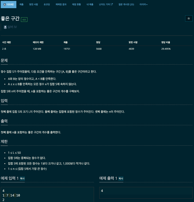 백준 1059번 좋은 구간 문제는 특정 정수 (n)을 포함하지 않는 좋은 구간을 찾아, 그 안에서 (n)보다 작은 숫자와 큰 숫자 사이의 조합을 구하는 문제입니다.