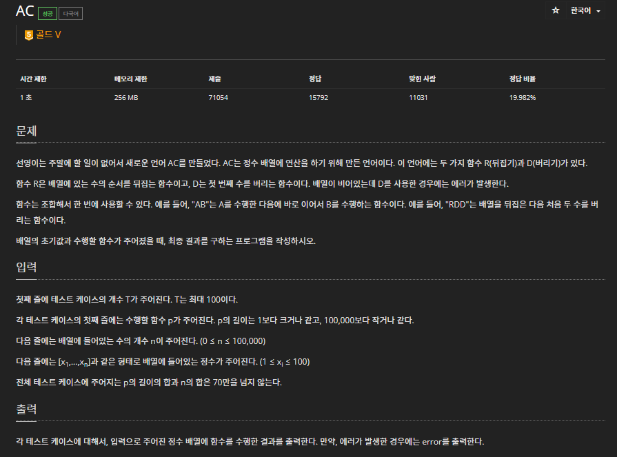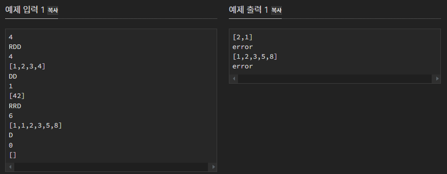 4. T <= 100, 1 <= p(수행할 함수) <=100,000, 0 <= 배열에 들어있는 수의 개수 <= 100,000, 1 <= xi(정수의 크기) <100