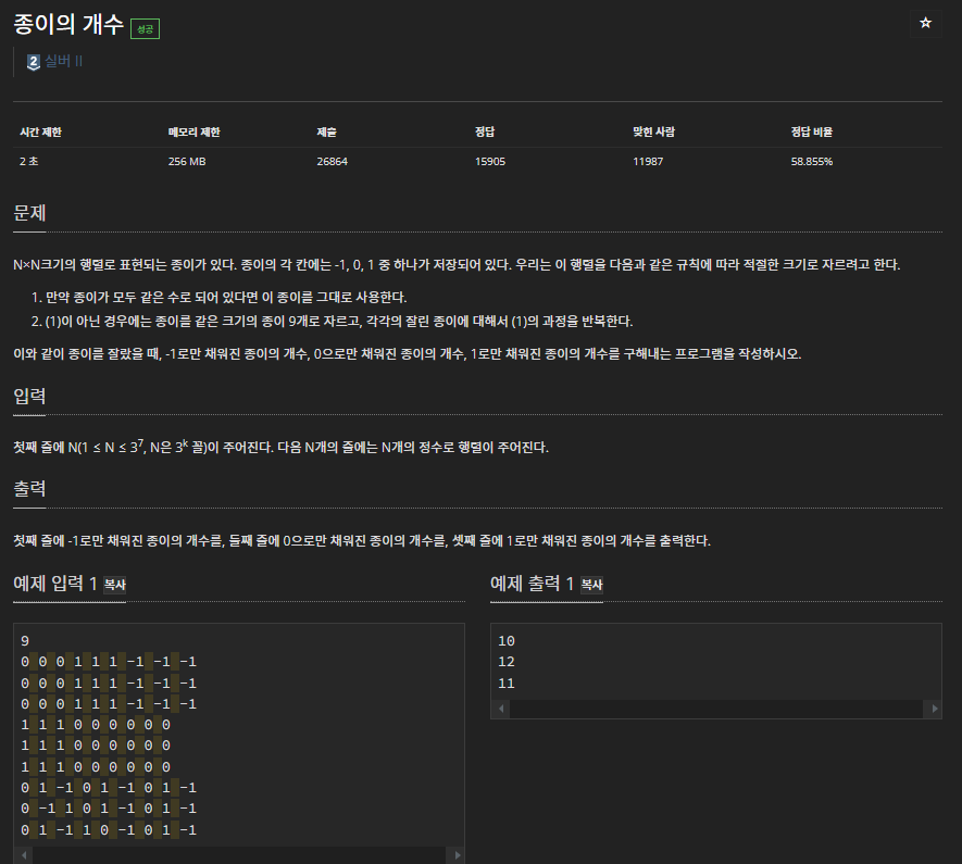 // 2. (1)이 아닌 경우에는 종이를 같은 크기의 종이 9개로 자르고, 각각의 잘린 종이에 대해서 (1)의 과정을 반복한다.