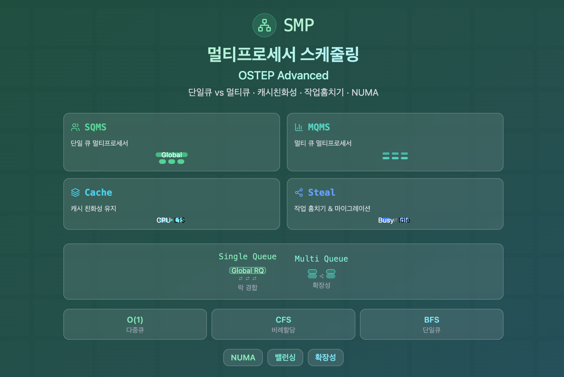 - SQMS: 정책 일관성과 구현 단순함이 장점. 그러나 락 병목과 친화성 악화가 약점.