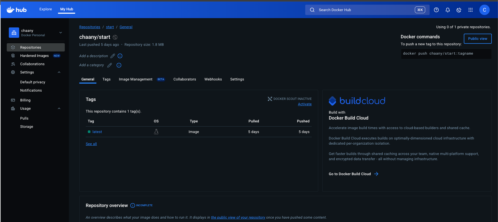 아래 예시는 chaany/start 이미지를 빌드 후 Docker Hub로 푸시한다.