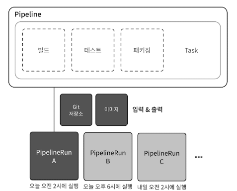 - PipelineRun: 그 Pipeline을 실제로 한 번 실행한 인스턴스