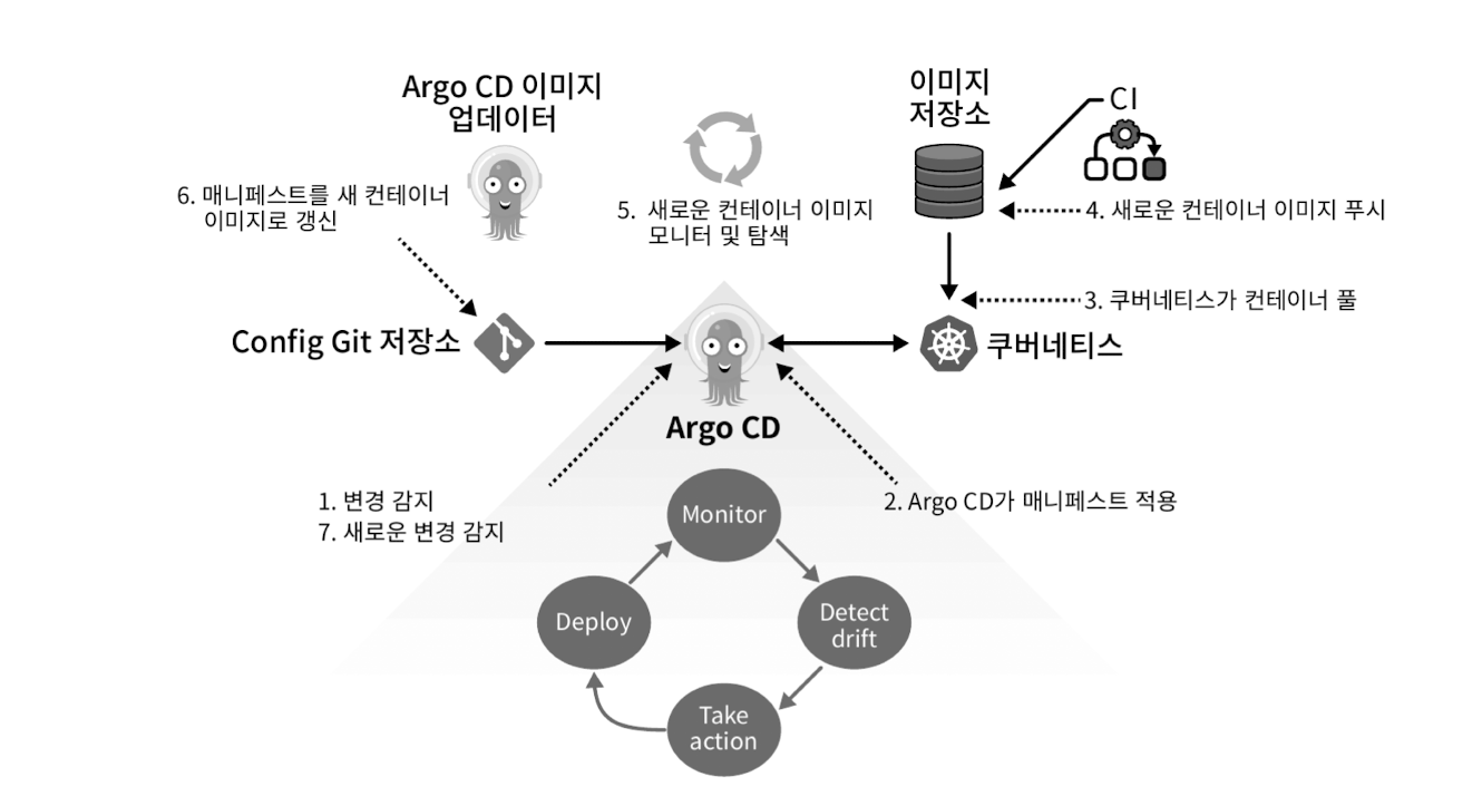 - Argo CD는 Git을 단일 진실 공급원으로 보고, Git에 선언된 상태를 쿠버네티스 클러스터에 자동으로 유지시키는 GitOps형 CD 컨트롤러다.