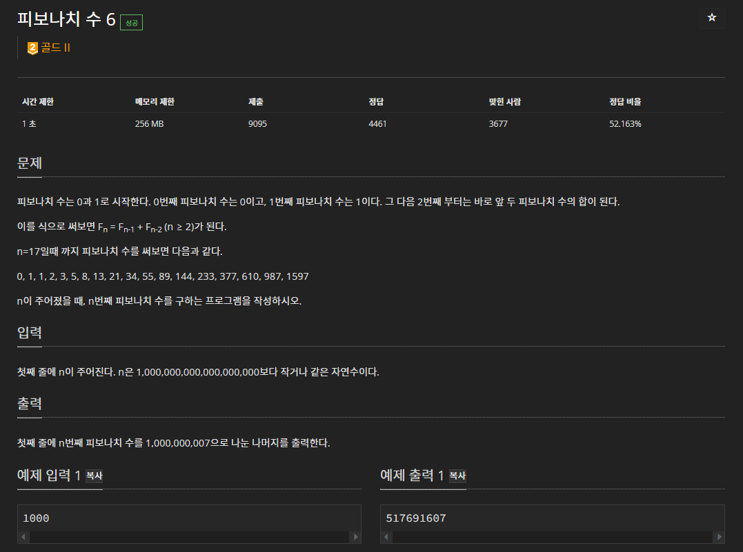 해당 문제는 그냥 우연찮게 맞추게 된 문제이다. 이리 저리 생각하다가 그냥 점화식을 행렬로 만들어볼까? 해서 그냥 만들어본 행렬의 곱이 피보나치수열이길래 행렬거듭제곱을 통해서 풀게 된 문제이다.