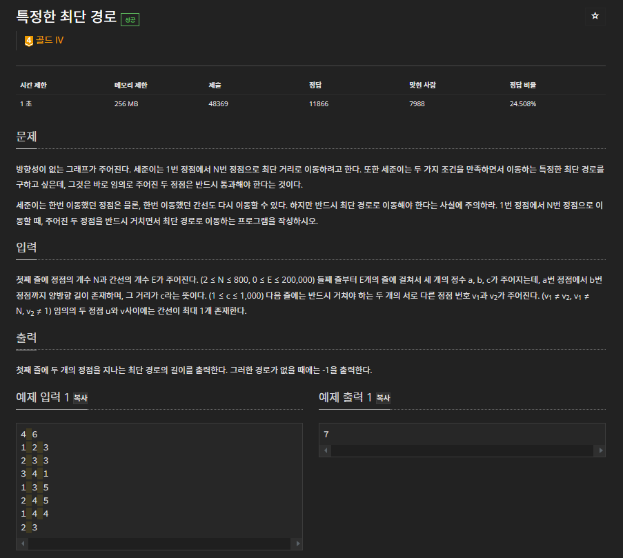 // 정점의 개수 N과 간선의 개수 E가 주어진다. (2 ≤ N ≤ 800, 0 ≤ E ≤ 200,000)