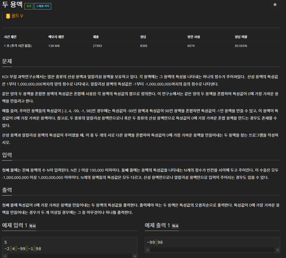 이 수들은 모두 -1,000,000,000 이상 1,000,000,000 이하이다. N개의 용액들의 특성값은 모두 다르고, 산성 용액만으로나 알칼리성 용액만으로 입력이 주어지는 경우도 있을 수 있다.