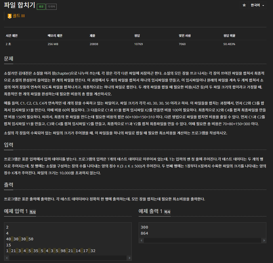 // 1. 두 개의 파일을 합칠 때 필요한 비용 = 두 파일 크기의 합