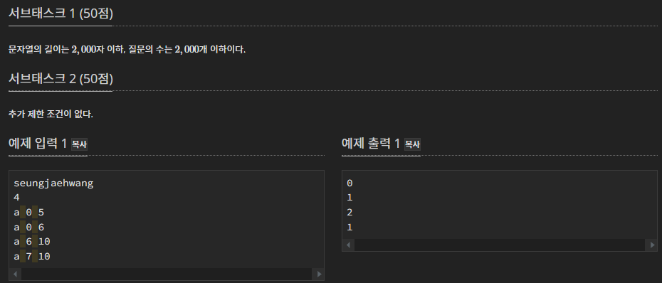 1. 문자열 길이 200,000이하, 문제 수 200,000이하, 인덱스는 0부터 시작