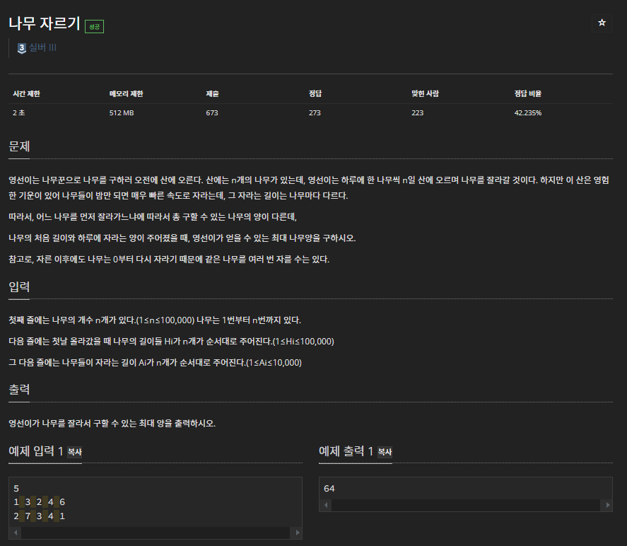 2. 나무가 자라는 게 등차 수열이네 -> 그러면 공차의 오름차순 대로 나무를 잘라볼까? -> 테케 맞음