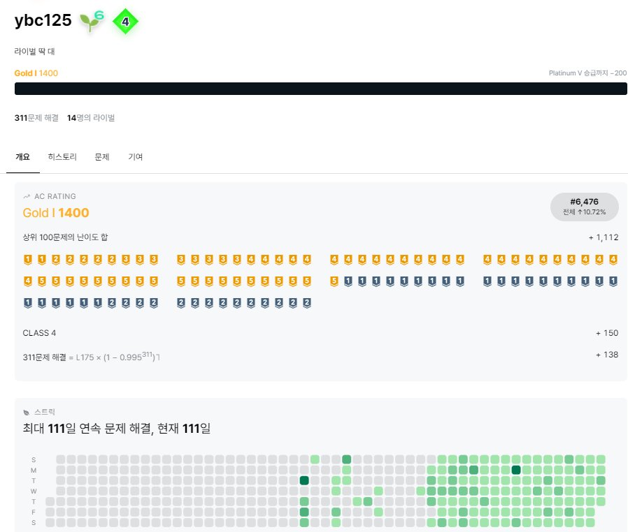 아 그리고 드디어 골드 1을 달성했다. 물골드이지만 노력의 결실로 더욱 더 열심히 알고리즘 공부를 할 동기부여가 되었다!