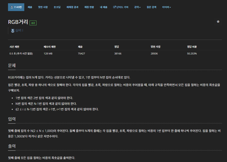 3. 2번에서 dp로다가 점화식인 f(특정 컬러를 선택하였을 때 N번 째 집의 도색 비용) = 특정 컬러로 N번 째 집의 도색 비용 + min(f(n번째 집에서 선택하지 않은 색을 선택하였을 때 N-1번 째 집의 도색 비용)) 도출