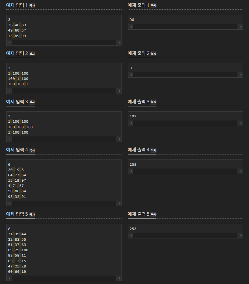 2. 각 집 방문할 경우에서 가장 작은 값 선택(그리디, dfs) -> 실패 (시간 터짐)