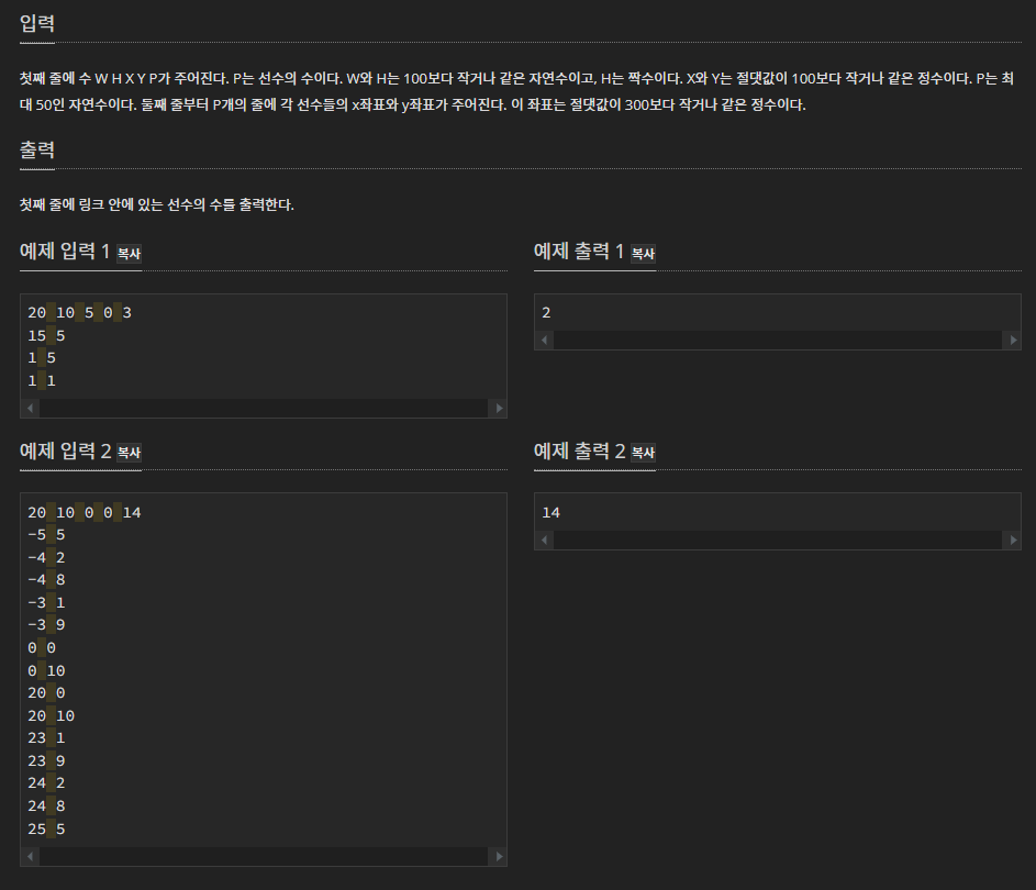 1.1 x <= px <= x + w && y <= py <= y + h ( 직사각형 내에 하키선수가 존재하는 지)