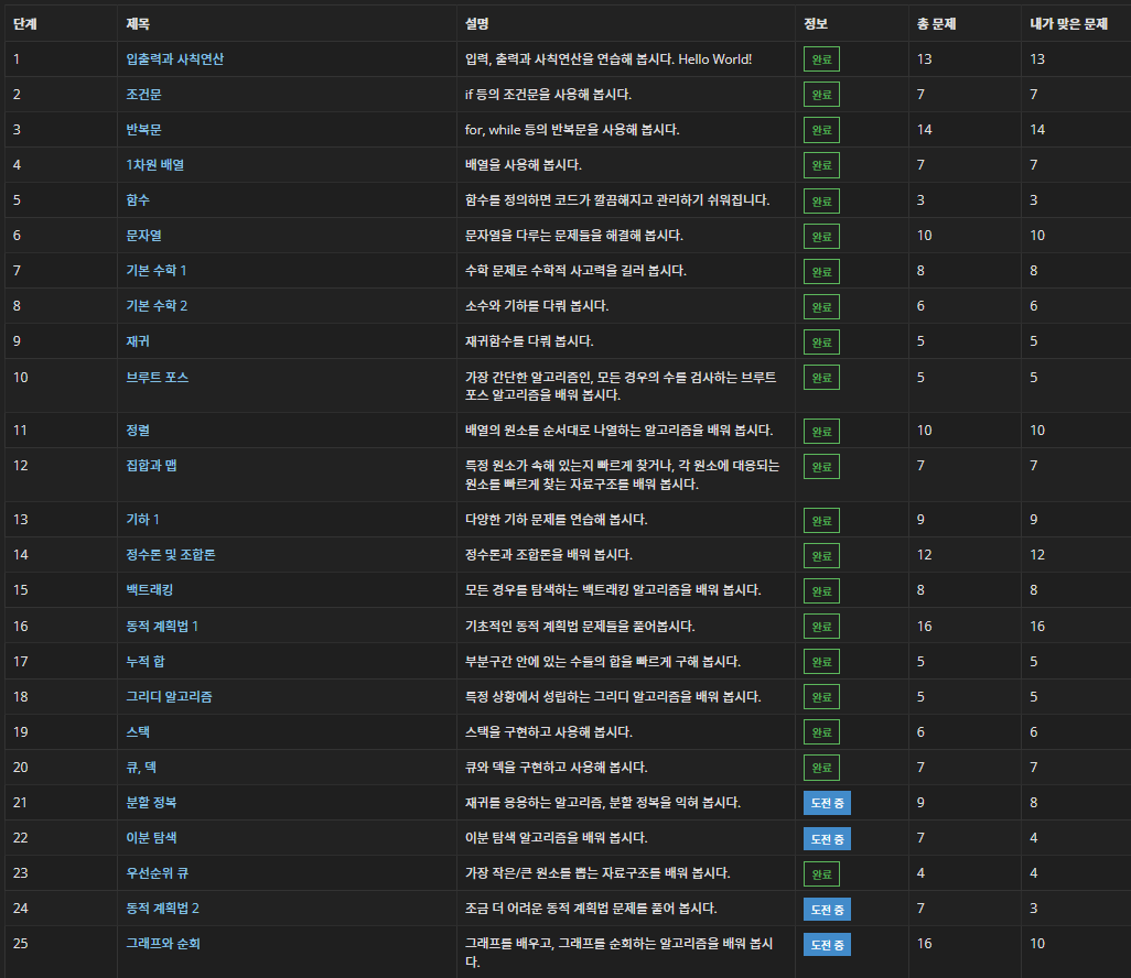 이제 백준 단계별로 풀기 25단계까지 14문제 남았다. 얼른 풀고 클래스 밀기, 프로그래머스 풀어야지...!